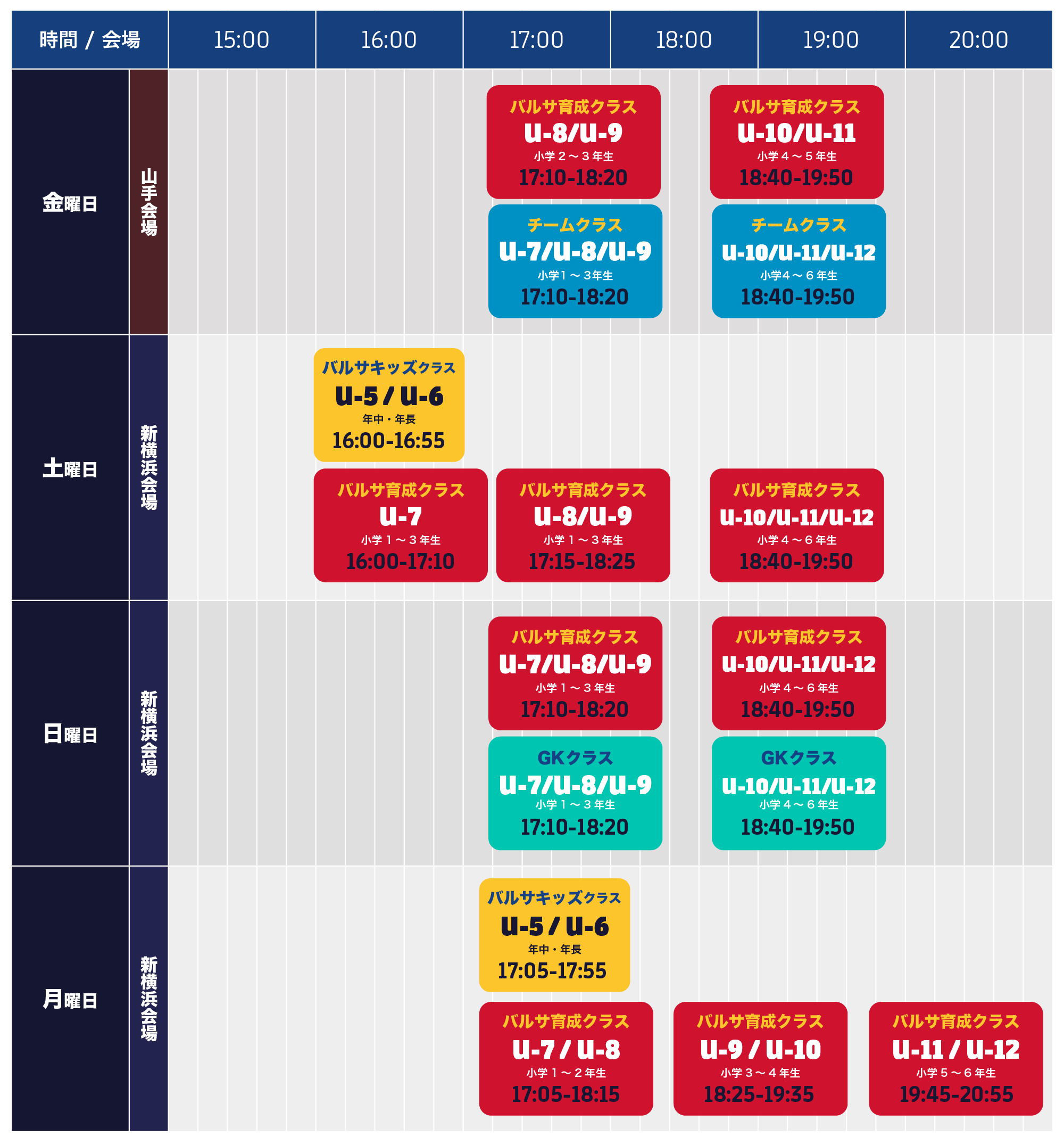 バルサアカデミー横浜校のタイムスケジュールは以下のとおりとなります。